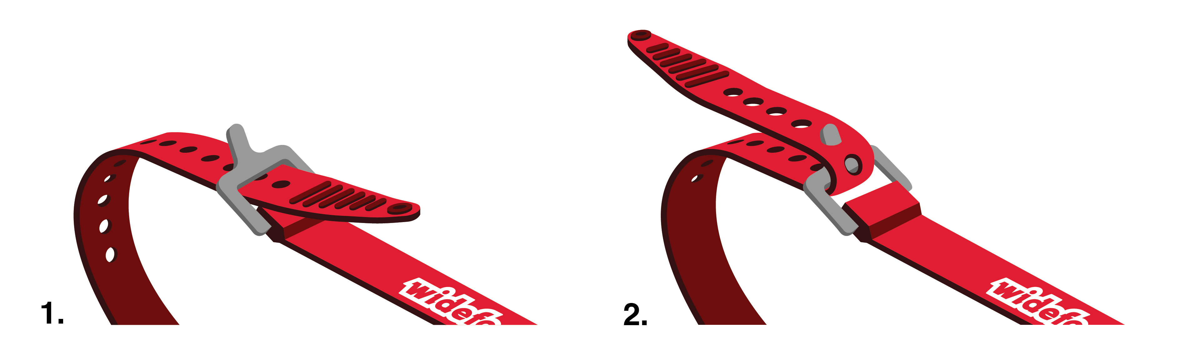 1. Inserta el extremo de la correa a través de la ranura de la hebilla, con el logotipo de Widefoot hacia afuera.