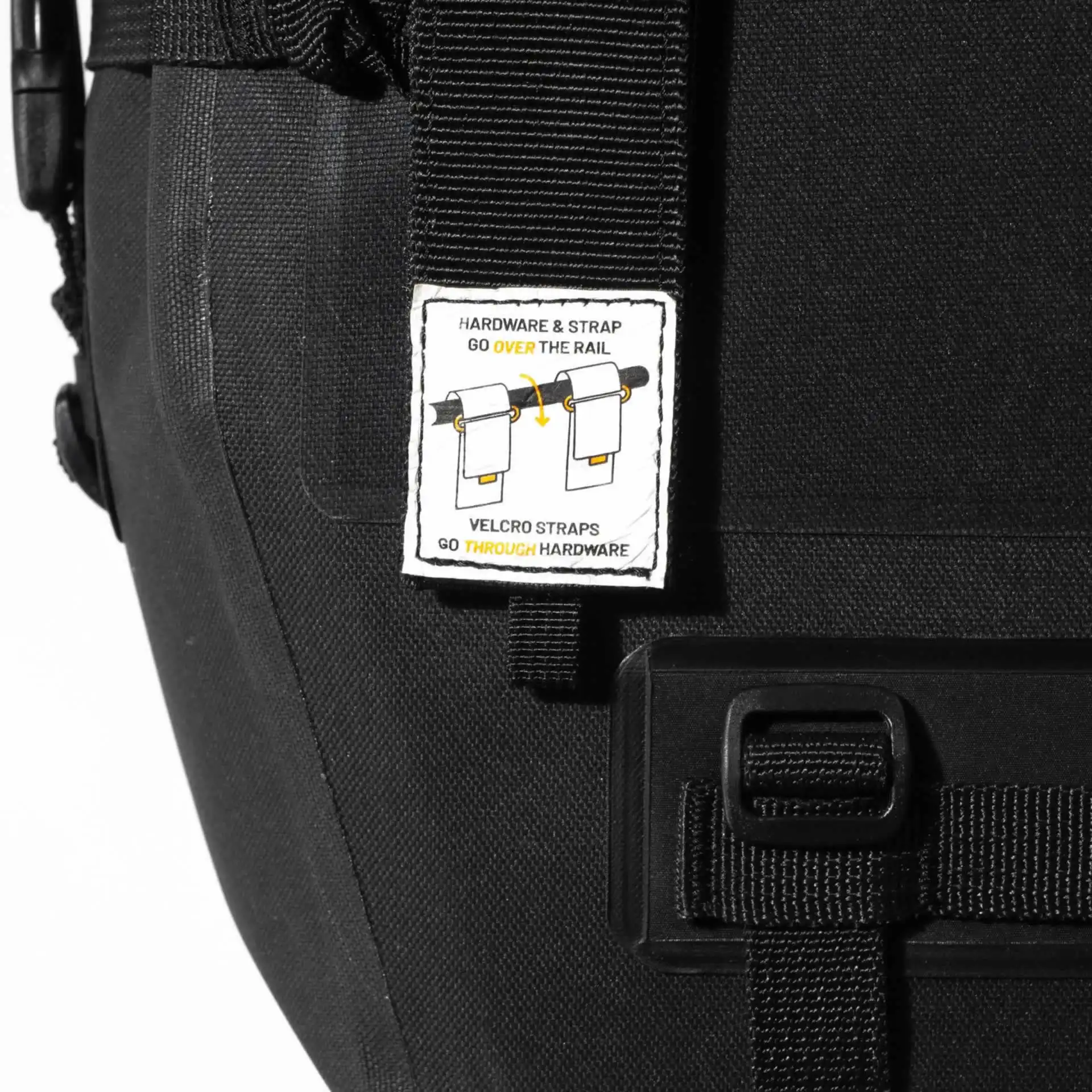 Los aseguramos al portabultos con correas de velcro en la parte superior y usamos la correa de compresión inferior para pasar por el portabultos y garantizar que tus alforjas no se conviertan en orejas de tonto cuando golpeas un bache, sin importar qué tan fuerte sea.