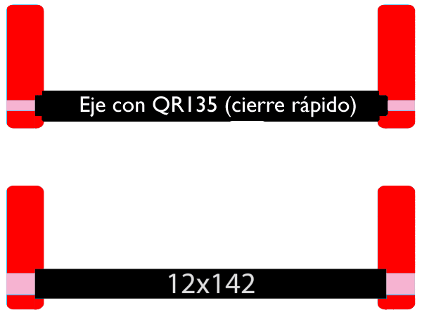 Al principio, tuvimos ejes traseros QR135mm. QR por sus siglas en inglés Quick Release, o cierre rápido. Lo de los 135 mm es la medida entre las punteras de los tirantes, sin considerar la ranura de donde termina por sentarse el eje del buje. La entrada en el mercado de los ejes de 12×142, en realidad es sólo un nuevo nuevo tamaño del eje, no un nuevo standard por si mismo. Sólo abrió el diámetro interior del buje para permitir la utiliziación de ejes pasantes. El resultado es una parte trasera más rígida ya que queda completamente cerrado y con rosca en el cuadro, lo que elimina cualquier posibilidad de que el buje se mueva en relación con el cuadro.