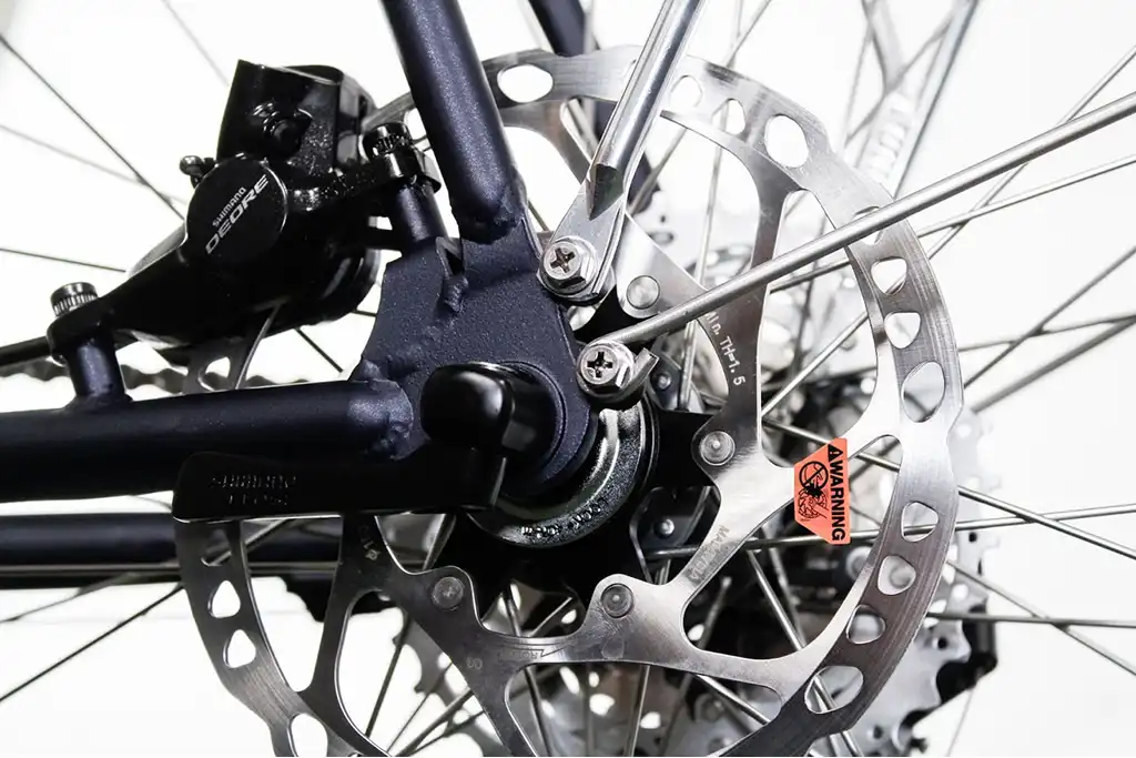 4. Frenos de disco hidráulicos Shimano Deore delantero y trasero. Efecto de frenado eficaz.