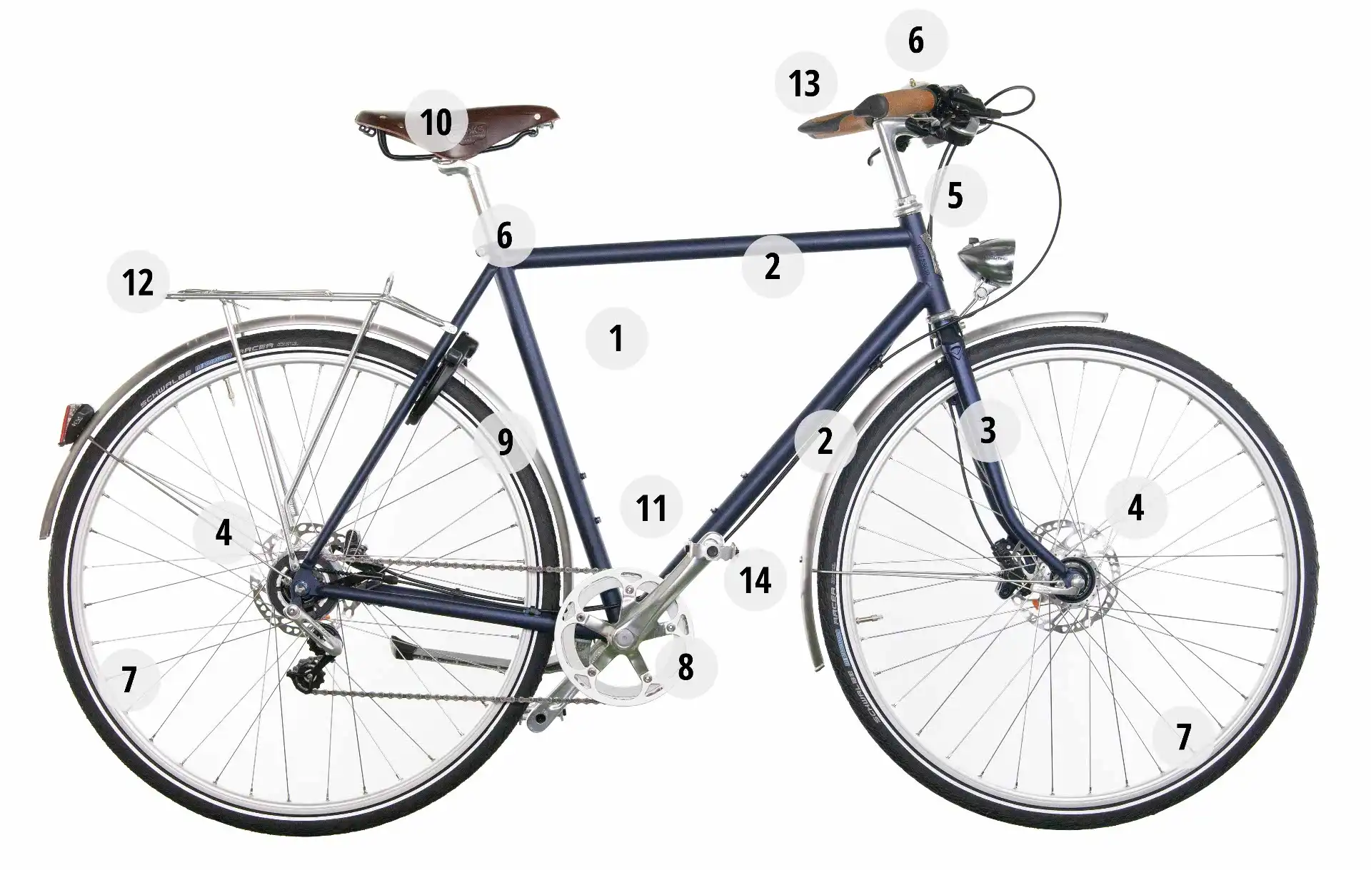9. Guardabarros, puntales, abrazaderas de portabultos y todas las tuercas y tornillos de acero inoxidable 18.8. Tija de sillín y potencia de aleación.