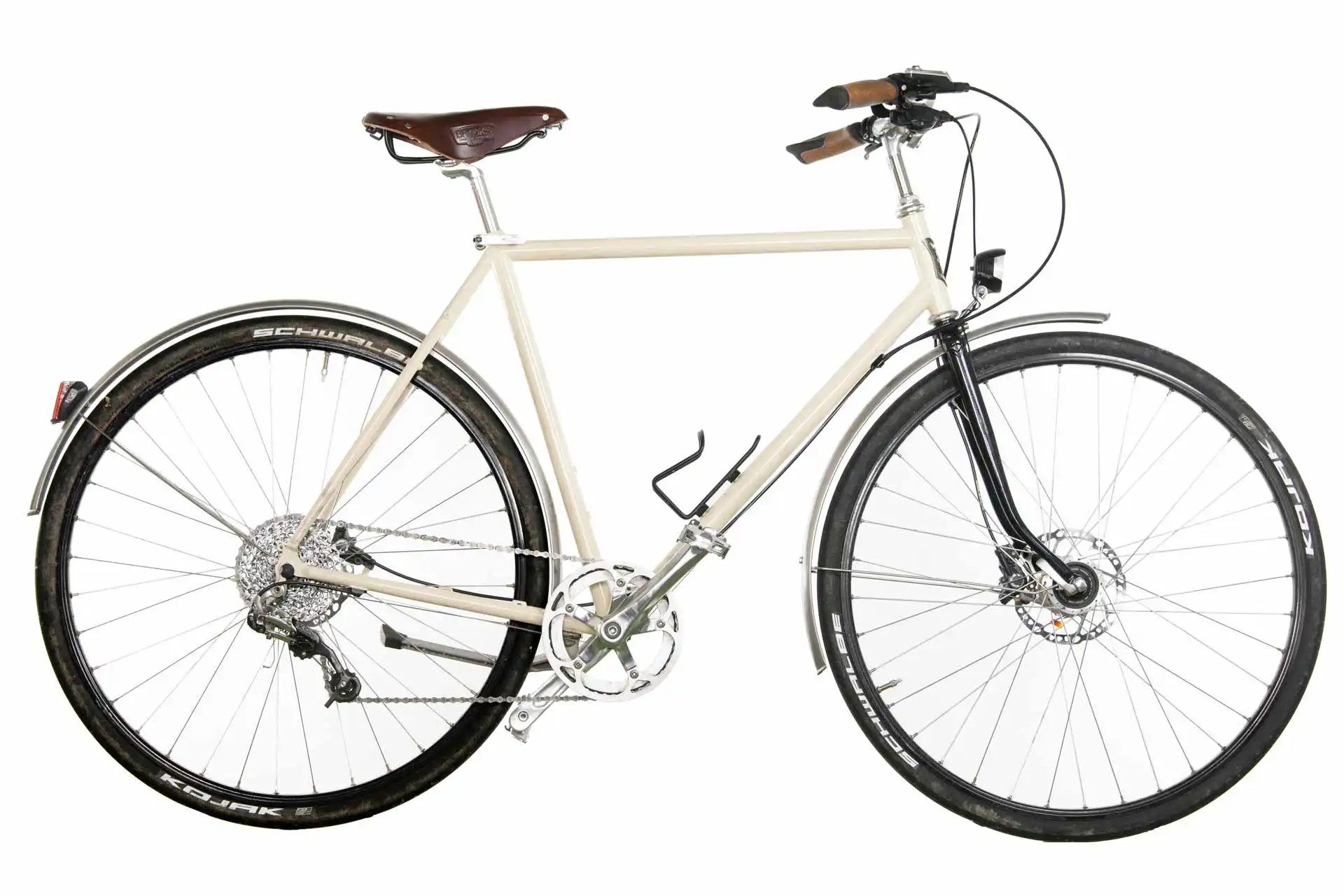 La Pilen GTV es una bicicleta de carreras de acero fabricada en Suecia, maravillosamente vivaz y exclusiva con frenos de disco hidráulicos y 11 marchas Shimano Deore. Dirección en duraluminio y puños de corcho. Formarás un equipo rápido y con estilo. La Pilen GTV es una auténtica café racer o una lujosa bicicleta urbana que puede con la mayoría de las cosas, incluido el desplazamiento diario. Puede equiparse con el sillín de cuero Brooks B17. El cuadro de acero CrMo 4130 con tubos conificados proporciona una experiencia de conducción excepcional.