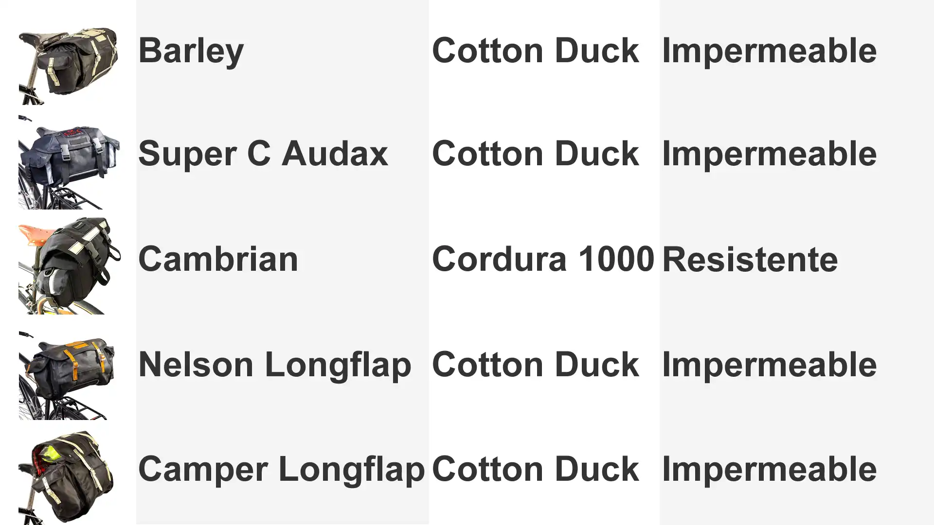 Carradice utiliza principalmente el Cotton Duck. El material transpira en una dirección mientras obstruye la entrada del agua en la otra. Cotton Duck es un material de algodón común pesado, encerado y tejido estrechamente. Resumiendo, el Cotton duck es 100% waterproof (aunque Carradice recomienda volver a encera cada cierto tiempo). También se utiliza el Cordura (1000 Denier military grade Cordura) que ofrece una buena resitencia al agua. Aquí el material utilizado en cada saddlebag: