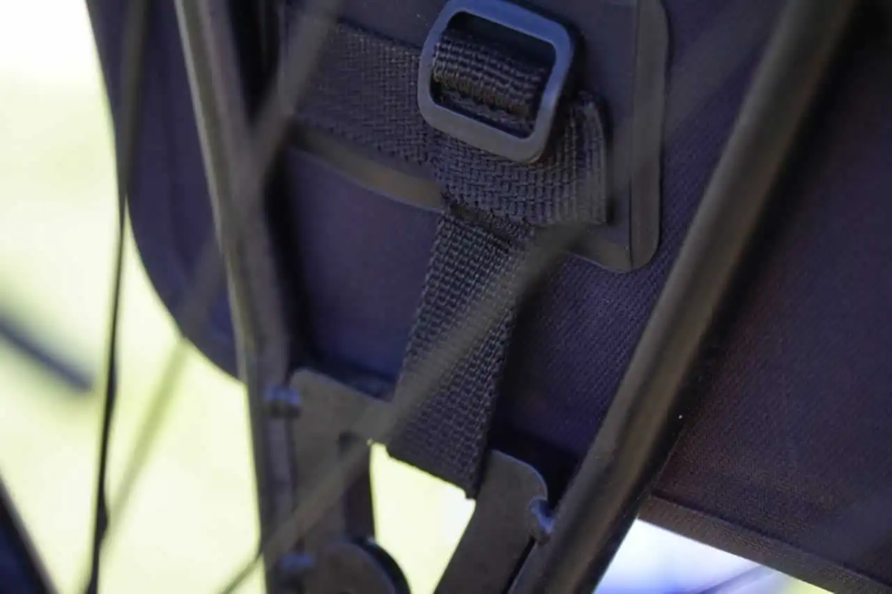 Los aseguramos al portabultos con correas de velcro en la parte superior y usamos la correa de compresión inferior para pasar por el portabultos y garantizar que tus alforjas no se conviertan en orejas de tonto cuando golpeas un bache, sin importar qué tan fuerte sea.