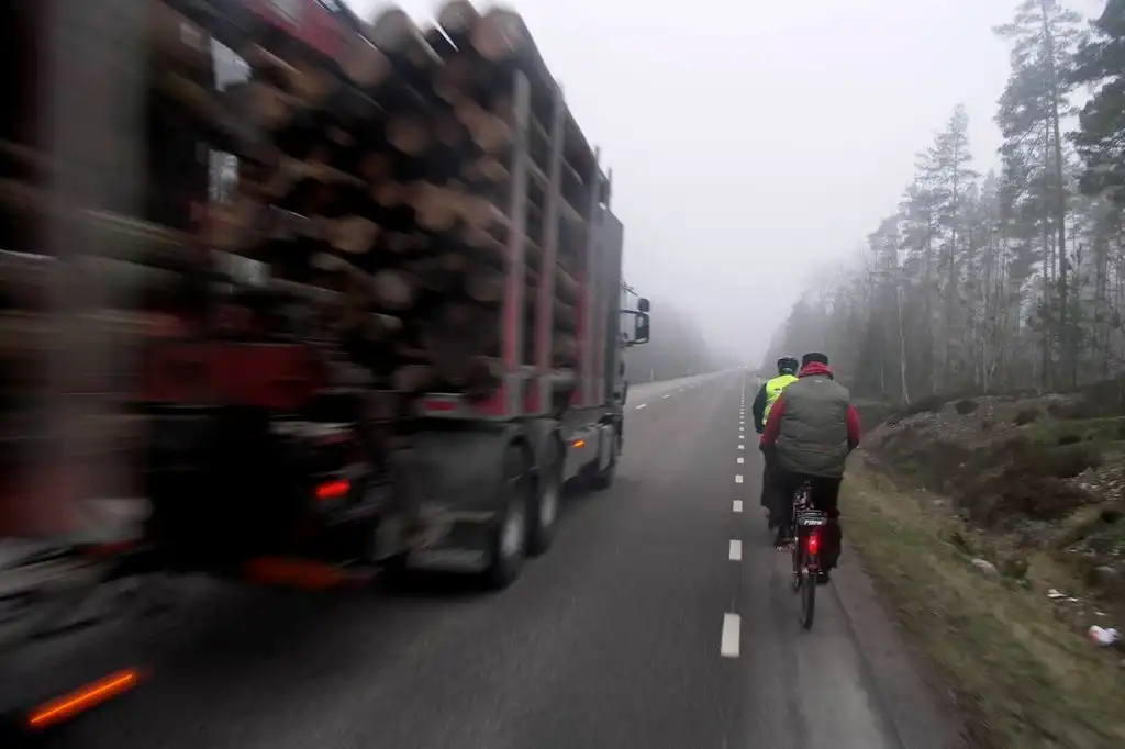 Comenzamos muy temprano desde Oskarshamn (07.15) dado que la autocaravana era demasiado estrecha. Con una espesa niebla y rondando los 0 grados montamos sobre nuestros caballos de acero y entramos en el denso trafico maderero, donde la madera corría en todas dirección a la vez. Unas pocas horas mas tarde llegamos al objetivo intermedio de la fabrica de Pilen en Malilla. Después de cargar el coche con piezas de repuesto nos dirigimos a Älmhult de donde es Ingvar Kamprad e IKEA (y nosotros sin saberlo) tentados por una ducha, alojamiento y comida.