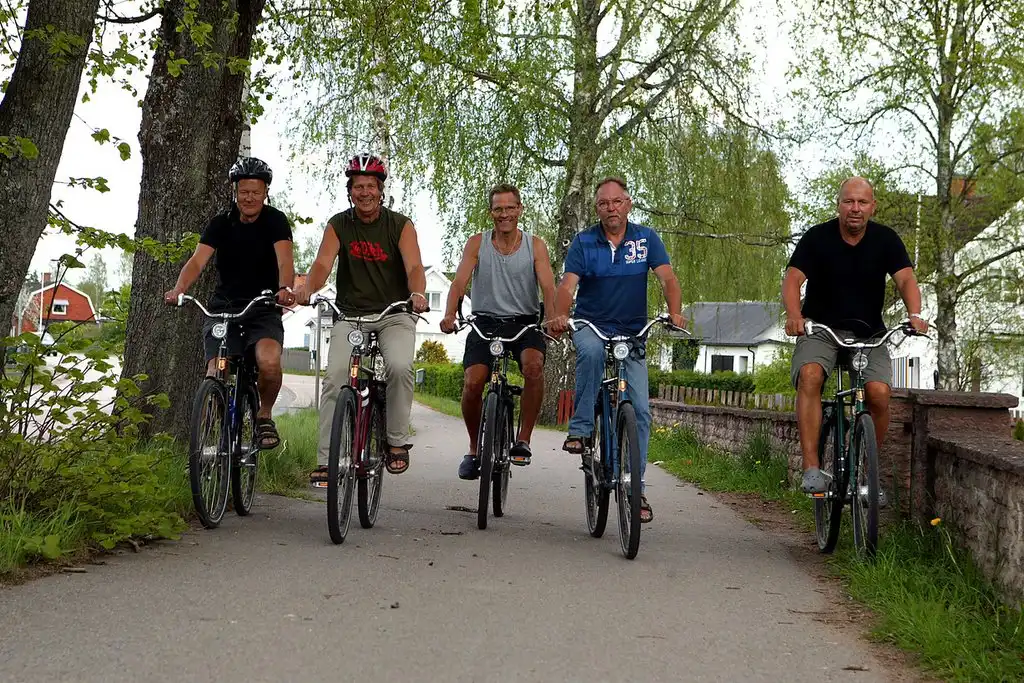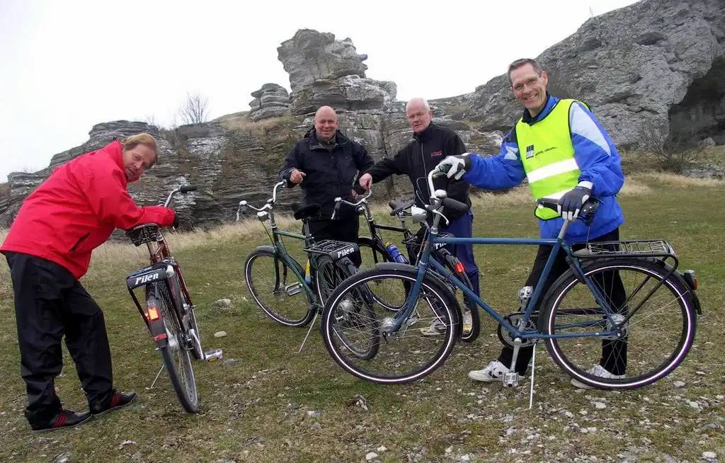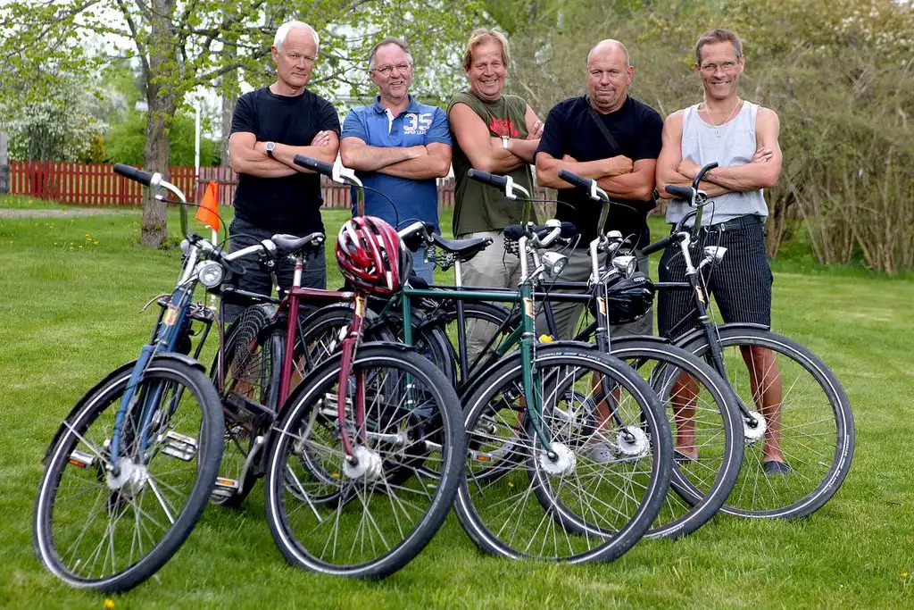 4 hombres de mediana edad con diferentes condiciones físicas-aunque montados en idénticas bicicletas Pilen Super Deluxe de 9 velocidades- comienzan su viaje desde Visby a Gotland en el extremo sur de Ljugarn, un recorrido de cerca de 100 kilómetros. El quinto ciclista se reúne con ellos en Målilla el lunes. Pronto sabrán si los sillines Brooks se ajustan a sus viejos traseros de Gotland o si el cuadro de marchas alemán funciona igual con aficionados y como no, si las bicicletas Pilen son tan fantásticas, equilibradas y fáciles de usar como prometen.