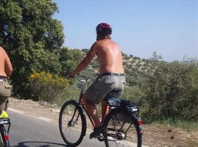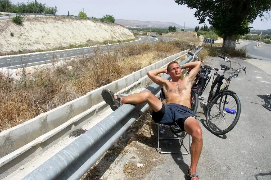 Cuesta abajo hacia Málaga por la española Costa del Sol con 30ºC, 4 hombres mayores semidesnudos en bicicleta, era algo que los españoles no habían visto nunca, muchas cejas levantadas al paso de estos lunáticos suecos. Del 1 al 4 de Mayo es fiesta en Andalucía, y nosotros terminamos en la Fiesta de la Cruz bebiendo vino y bailando flamenco con señoras y señoritas vestidas con el traje tradicional. "La vieja Dama" (el Peugeot, el coche soporte) se pone celosa y gasta sus últimos frenos en la ultima curva serpenteante del Rincón de la Victoria en la costa Mediterránea. Pero como viene siendo habitual, la suerte nos sonríe en medio de nuestro infortunio. Nuestros amigos ingleses, Magnus y Lottie, nos llevan a un mecánico de coches español y tras unas horas de disfrutar del sol y del mar Mediterráneo, la "Vieja Dama" consigue nuevos frenos y reanuda la caza de las esquivas bicicletas Pilen, que se encuentran a solo 150 Km de la meta. ¿Conseguirá alcanzar a las otras bicis en Gibraltar?