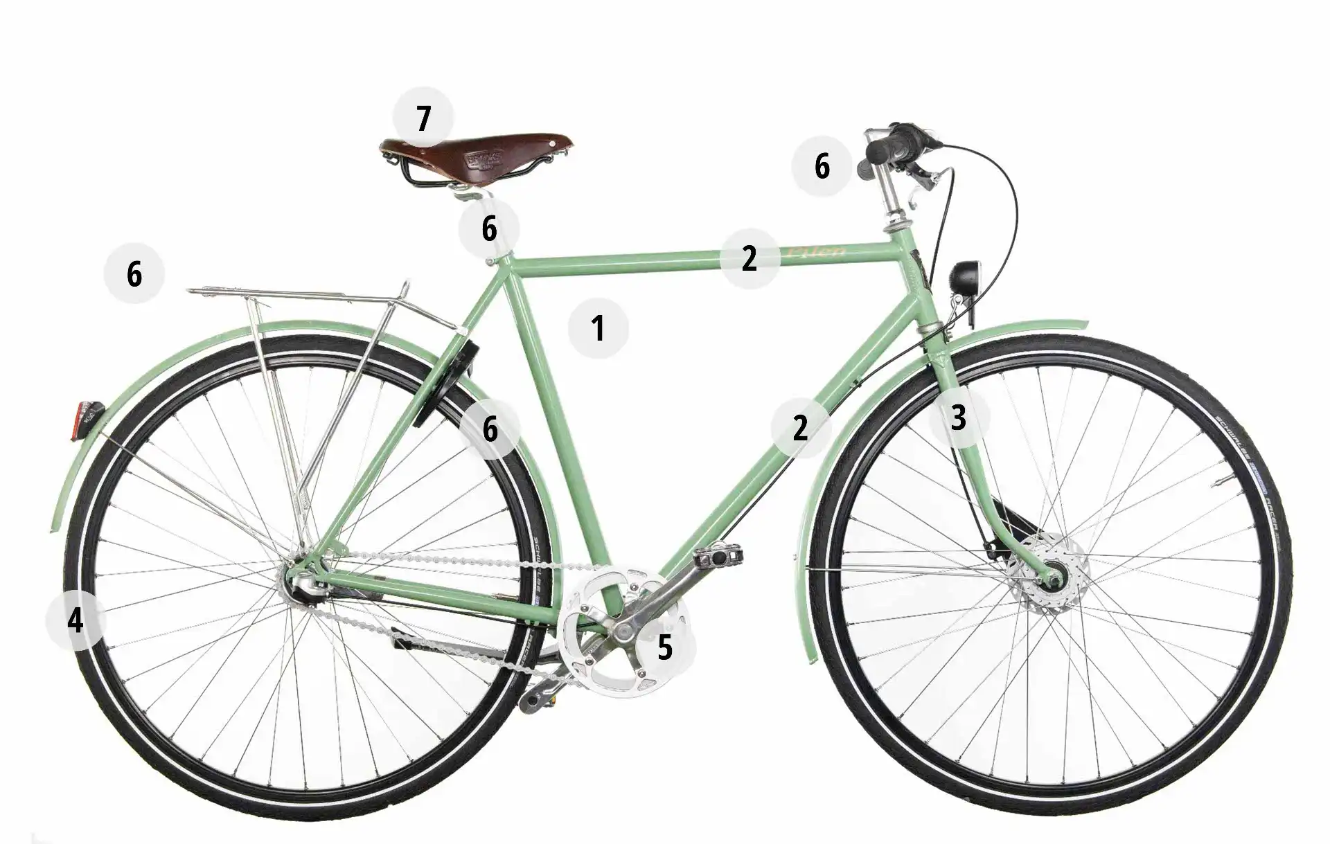 6. Guardabarros, puntales, abrazaderas de portabultos y todas las tuercas y tornillos de acero inoxidable 18.8. Tija de sillín y potencia de aleación.